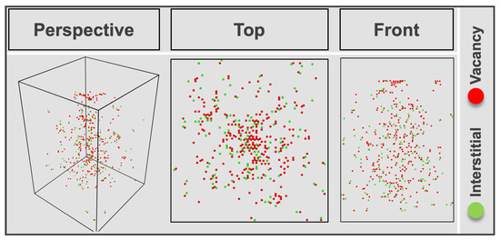 The Wigner-Seitz defect analysis was applied to identify the distribution of point defects, such as vacancies and interstitials, in the structure via the “OVITO” software (Version 3.9.2) [37] by comparing the structure configuration of GaN after 300 He ion impacts with the initial structure configuration (Figure 7). The distribution of vacancy and interstitial sites throughout the entire structure, extending beyond the local surrounding area of the probe, supports the experimental observations in Figure 4a.