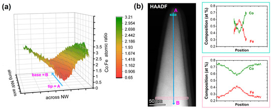 (a) Three-dimensional representation of the Co:Fe ratio along the main growth axis of a nanowire (NW), revealing the Fe-rich core and Co3Fe shell formation related to the HAADF image in (b). The locations are identified by the A and B labels along the blue arrow in the HAADF, as well as the 3D representation. (b) The cyan- and pink-framed graphs at the right are taken from the shown frames in the HAADF image and illustrate the lateral composition evolution of the inner Fe-rich channel with low effect of the onset in shell formation and the levelling off in the composition evolution in a 3:1 Co:Fe ratio (75:25 at %) for the continuing shell growth caused by low-energy electrons. The composition is simplified as being a purely metallic deposit even though small carbon and oxygen contents are present (<7 at % in total).