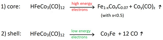- T P, R.K.; Unlu, I.; Barth, S.; Ingólfsson, O.; Fairbrother, D.H. Electron Induced Surface Reactions of HFeCo3(CO)12, a Bimetallic Precursor for Focused Electron Beam Induced Deposition (FEBID). J. Phys. Chem. C 2018, 122, 2648–2660. [Google Scholar] [CrossRef]