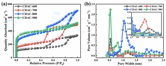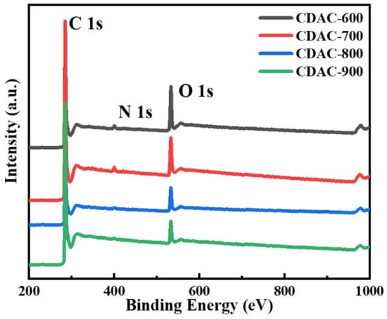 The pore structure of CDAC-X is analyzed by an N2 adsorption–desorption instrument, and the results are presented in Figure 1a. The adsorption isotherms of four kinds of activated carbon exhibited type Ⅳ, which is commonly observed in mesoporous carbon materials [33,34]. The entire process can be divided into three stages. In the first stage (P/P0 < 0.1), there is a rapid increase in N2 adsorption capacity, indicating the presence of micropores within the carbon materials. The second stage (0.1 < P/P0 < 0.9) represents a slower growth rate of N2 adsorption and corresponds to mesopores, where hysteresis loops are observed [35]. It should be noted that CDAC-900 exhibits the highest adsorption value in the first stage and has the smallest hysteresis loop in the second stage, suggesting a lower proportion of mesopores compared to other activated carbon materials [36,37]. The third stage is the saturated adsorption zone. The pore structure distribution (Figure 1b and inset) is aligned with the isothermal adsorption line: CDAC-900 primarily contains micropores ranging from 0.5 to 2 nm, while CDAC-600, CDAC-700, and CDAC-800 mainly consist of mesopores ranging from 2 to 15 nm along with some percentage of microporous pores as well. Furthermore, for CDAC-600 specifically, its mesopore distribution predominantly falls within a range of 7.5 to 12.5 nm; for CDAC-700, it ranges from 5 to 10 nm; and for CDAC-800, it ranges from 2 to 5 nm. Generally speaking, an increase in temperature can lead to more concentrated pore size distributions.