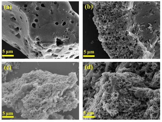 The morphology of activated carbon from coal-based carbon dots obtained at different activation temperatures is shown in Figure 2. With the increase in the activation temperature, abundant pores gradually appear on the surface of the activated carbon, and the pores continue to expand and deepen, forming numerous uniformly distributed honeycomb pores. When the activation temperature is 600 °C, the porous structure is formed initially (Figure 2a); with the further increase in the activation temperature, the activation reaction is strengthened and more pores are formed (Figure 2b); when the activation temperature is 800 °C, the activation reaction is more intense, and the number of pores of activated carbon increases sharply (Figure 2c). Therefore, CDAC-800 has a porous structure and high specific surface area, which is conducive to charge storage and thus enhances the specific capacitance. Moreover, CDAC-900 in Figure 2d has negligible changes in morphology compared with CDAC-800.