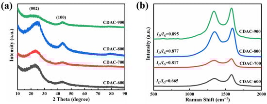 The XRD pattern of CDAC-X is shown in Figure 3a. For activated carbon prepared at different activation temperatures, two diffraction peaks are observed near 24.7° and 43.6°, corresponding to the (002) and (100) planes of graphite crystal, respectively. With an increase in activation temperature up to 900 °C, the sharpness of these peaks diminishes, and their intensity weakens, indicating a decrease in graphitization degree and an enhancement of amorphous structure. This can be attributed to the intensified higher temperature leading to the insertion of KOH into carbon sites and subsequent reactions with carbon atoms that result in disruption of graphite microcrystalline structure [37]. Among all samples, CDAC-800 exhibits the sharpest characteristic peak, suggesting superior crystallinity which is advantageous for enhancing its rate performance [24,31].