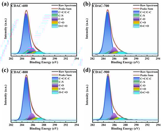 C 1s spectra with fitted peaks of CDAC-X: (a) CDAC-600; (b) CDAC-700; (c) CDAC-800; (d) CDAC-900.