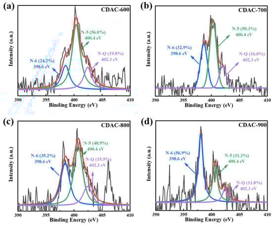 The atomic content of nitrogen also decreases with the increase in the activation temperature, suggesting that KOH not only etches away the carbon atoms but also consumes nitrogen atoms. The high-resolution N 1s spectrum of CDAC-X (Figure 6) is fitted to three peaks, assigned to N–6 (398.6 eV), N–5 (400.4 eV), and N–Q (402.3 eV) [42,43]. Among these forms, N–6 and N–5 are the predominant types of nitrogen. These two forms provide conjugated electrons and sufficient active sites beneficial for enhancing the supercapacitor’s electrochemical performance [44].