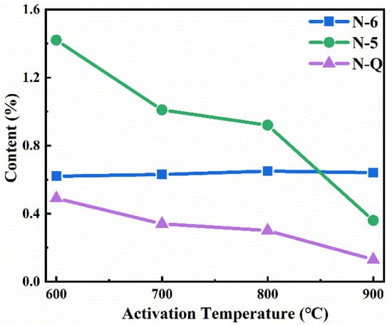 By calculating the integral area of each fitting peak, it can be observed that the relative proportion of N–6 increases with the rise in activation temperature, while that of N–5 decreases. Furthermore, analyzing the overall content variation of N–containing functional groups concerning activation temperature (as shown in Figure 7), it can be inferred that the content of N–6 remains relatively stable, whereas both N–5 and N–Q gradually decrease. Notably, there is a more significant reduction in N–5 content. Hence, it can be concluded that the decline in nitrogen elements primarily stems from the removal of N–5 content. This phenomenon can be attributed to the lower thermal stability of pyrrole-type nitrogen (N–5) compared to pyridine-type nitrogen (N–6), as indicated by their respective activation energies [45]. Although a lower activation temperature is not favorable for pore development, it facilitates the retention of oxygen-containing and nitrogen-containing functional groups within the carbon dots themselves, which improves the wettability of material and increases pseudocapacitance.