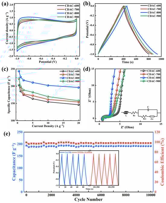Electrochemical performances of CDAC-X: (a) CV curves of CDAC-X at 5 mV s−1; (b) GCD profiles of CDAC-X at 0.5 A g−1; (c) the specific capacitances of CDAC-X from 0.5 to 20 A g−1; (d) Nyquist plots; (e) The performance with 10,000 cycles of CDAC-800 at 20 A g−1. X is the carbonization temperature.