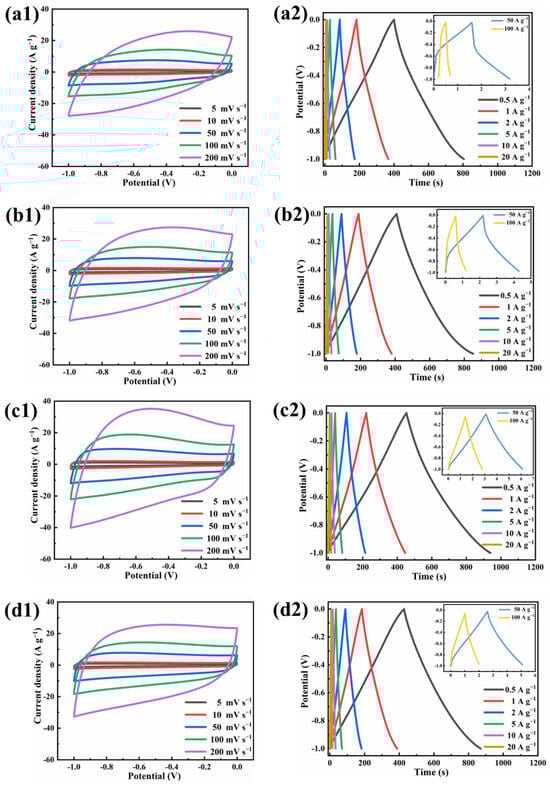 CV curves of CDAC-X measured from 5 to 200 mV s−1 and GCD curves of CDAC-X from 0.5 to 20 A g−1: (a1–d1) CV curves; (a2–d2) GCD curves. X is the activation temperature.