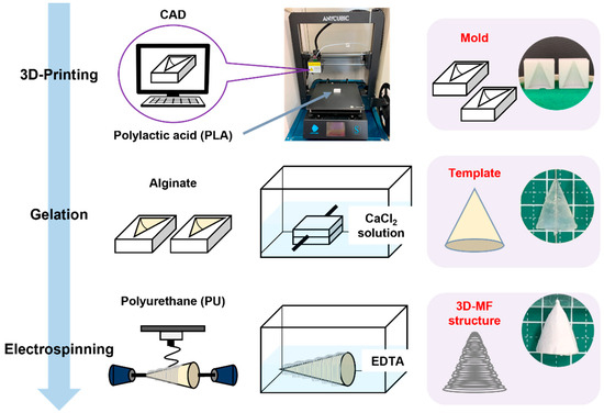 In this study, an alginate hydrogel template was constructed by infusing an alginate solution into a 3D-printed mold. Gelation was facilitated by the presence of calcium ions. The PU microfibers were deposited onto this template with electrospinning, resulting in a 3D construct. Subsequently, the alginate template was dissolved in an EDTA solution, yielding a unique 3DMF structure composed exclusively of PU microfibers (Figure 1).