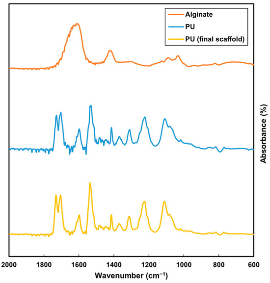 FTIR analysis of alginate (orange), original PU (blue) and washed PU scaffold (yellow).