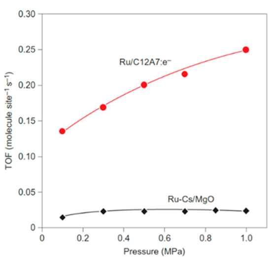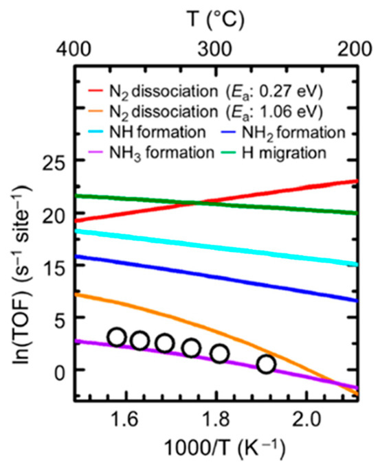- Kobayashi, Y.; Kitano, M.; Kawamura, S.; Yokoyama, T.; Hosono, H. Kinetic evidence: The rate-determining step for ammonia synthesis over electride-supported Ru catalysts is no longer the nitrogen dissociation step. Catal. Sci. Technol. 2017, 7, 47–50. [Google Scholar] [CrossRef]