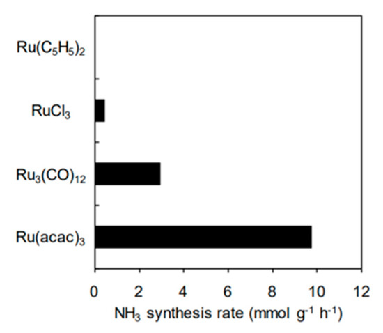 - Saadatjou, N.; Jafari, A.; Sahebdelfar, S. Ruthenium Nanocatalysts for Ammonia Synthesis: A Review. Chem. Eng. Commun. 2015, 202, 420–448. [Google Scholar] [CrossRef]