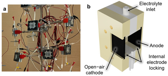 To promote a direct oxygen reduction reaction (ORR) [15,35], a catalyst paste was deposited on the micro-porous surface [15,16,32,33,34,35]. The paste was based on 0.5 mg/cm2 of platinum (10 wt% on carbon, from Sigma Aldrich, Darmstadt, Germany) and 3 mg/cm2 of Nafion (5 wt%, from Sigma Aldrich, Darmstadt, Germany) acting as a binder. The cathode and anode electrodes were internally held in place and electrically contacted by 3D-printed frames threaded with titanium wire (Goodfellow Cambridge Ltd., Huntingdon, UK).