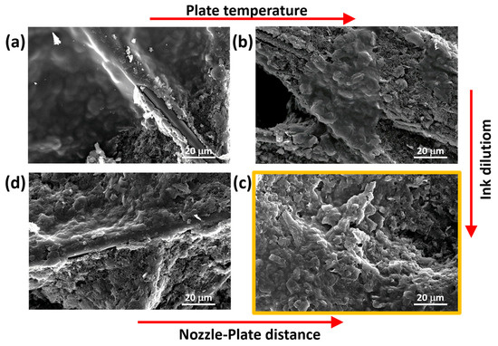 FESEM images of samples prepared to optimize the deposition parameters: comparison of (a,b) provides information on the role of the temperature; comparison of (c,d) allows us to appreciate the impact of the nozzle-plate distance; comparison of (b,c) demonstrates the role of ink dilution.