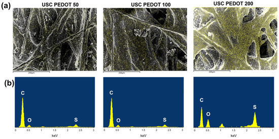 (a) FESEM images of the fabricated anodes’ surface (grey scale), overlapped with a map of the spatial distribution of sulphur (yellow pixels) obtained via EDX (sulphur Kα peak at 2.307 keV). (b) Corresponding EDX spectra, where the intensities of Kα peaks of carbon, oxygen, and sulphur provide information on their relative abundance. The USC PEDOT 200 image was modified and reprinted from [33] under a CC BY 4.0 license.