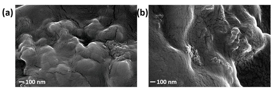After optimization, a final analysis has been dedicated to the nano-scale appearance of the deposited layer. The FESEM analysis of the samples USC PEDOT 100 and USC PEDOT 200 is reported in Figure 6a and Figure 6b, respectively.