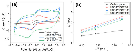 (a) Cyclic voltammograms obtained on all investigated electrodes: USC PEDOT 50 (red line), USD PEDOT 100 (blue line), USC PEDOT 200 (green line), and bare carbon paper (black line); (b) Determination of electrochemical active surface area, obtained by inverting Matsuda’s equation.