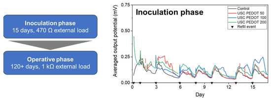 Figure 8 reports the average potential output, generated by each MFCs’ triplet during the initial inoculation phase. All results allowed us to confirm the successful biofilm growth on all anode electrodes’ surface, with MFCs providing a stable voltage trend already after one week from the beginning of the experiment. In particular, it was possible to highlight how the presence of the PEDOT:PSS nanostructured layer on the anodes’ surface positively affected the biofilm formation.