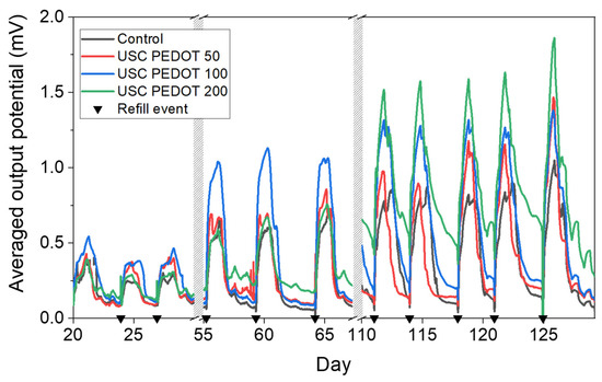 Considering open circuit potentials, the measured values were 26 mV (Control), 29 mV (USC PEDOT 50), 41 mV (USC PEDOT 100), and 44 mV (USC PEDOT 200).