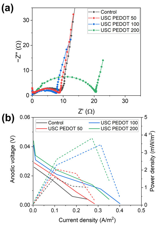 Figure 10b displays LSV characterization, with solid lines representing polarization curves (left axis) and dashed lines (right axis) the power density curves. From LSV characterizations, it was possible to confirm the trend observed in previous characterizations. Indeed, the performance of carbon paper electrodes was significantly increased by USC PEDOT 100 and USC PEDOT 200 electrodes. Nonetheless, no significant improvement can be observed when increasing the PEDOT:PSS amount above 100 μg/cm2.