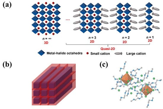 Figure 4. (a) Schematic representation of metal halide perovskites with 3D, 2D, and quasi-2D structures. Reproduced with permission [10]. Copyright 2020, American Chemical Society. (b) Schematic illustration of molecular level 1D structure (blue: metal halide chains/wires, red: organic cations). Reproduced with permission [44]. Copyright 2018, Elsevier B.V. (c) Schematic illustration of molecular level 0D structure—Individual [SnBr6]4−octahedra surrounded by (C4N2H14Br)+organic ions. Reproduced with permission [44]. Copyright 2018, Elsevier B.V.
