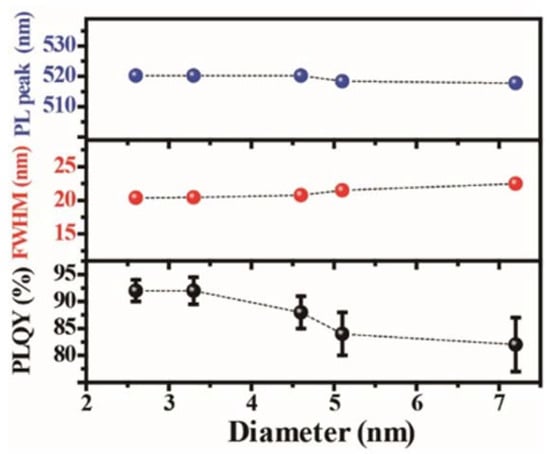 Figure 6. PL emission peak, FWHM, and PLQYs as a function of the size of MAPbBr3. Reproduced with permission [61]. Copyright 2015, American Chemical Society.