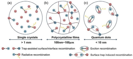 Generally speaking, the scale of OHPs strongly influences the optical and electronic properties correlated with their photo-exited properties and defect characteristics. Figure 1 depicts the features of excited states and some fundamental exciton/carrier processes in OHPs. Upon excitation, hot carriers relax on a sub-picosecond time scale to excitons (Process 1) [34]. The excitons typically separate into free carriers. Otherwise, they recombine and re-form the ground state. Aside from expected temperature dependences, it is evident that the physical scale of the material primarily decides the probabilities of these exciton dynamics in the hybrid perovskites. We give some examples below.