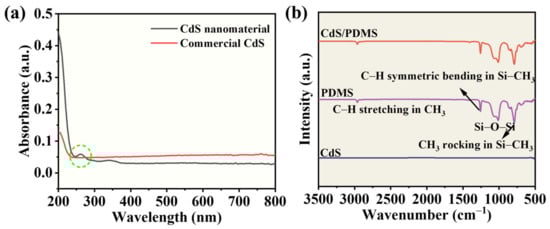 34]. This result further attests to the successful synthesis of nanostructured N-CdS via a straightforward ultrasonication method and highlights the strong electron confinement effect in N-CdS. Moreover, we employed FT-IR analysis to investigate CdS, PDMS, and CdS/PDMS.