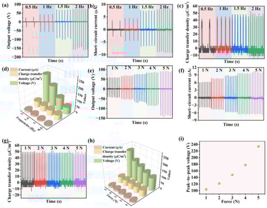 Figure 6a–c illustrate the variations in output voltage, short-circuit current, and charge transfer density of the TENG across different frequencies. All these parameters exhibited an increasing trend as the frequencies were raised. Specifically, within the frequency range of 0.5 to 2 Hz, the peak-to-peak voltage increased from 57.6 to 236 V, the peak-to-peak short-circuit current increased from 6.4 to 17.4 μA, and the charge transfer density increased from 41 to 55 μm/m