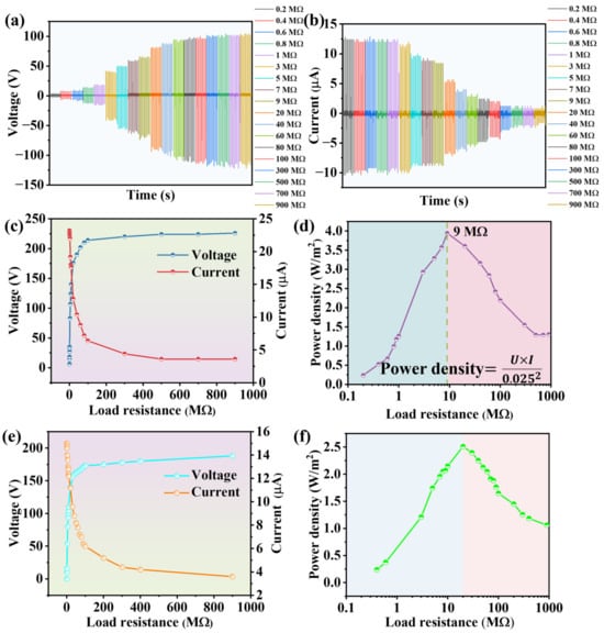 Figure 7c, the response of the output voltage and current varies significantly with increasing external load resistance. The output voltage steadily increased with higher external load resistance, reaching 226 V in the end. Notably, the voltage exhibits rapid growth when the load resistance was below 100 MΩ, which was followed by a considerable slowdown beyond this threshold, nearly reaching stagnation. On the contrary, the behavior of the output current is distinctly different. As the external load resistance rises, the output current notably declines, particularly before the 100 MΩ mark, which was followed by a slower rate of decrease beyond this point. The highest output current achieved at 200 KΩ was 23.2 μA. These divergent trends in voltage and current changes are primarily attributed to the circuit voltage and inherent factors of the TENG. The power density exhibited a rapid increase to a maximum value and subsequently decreased (