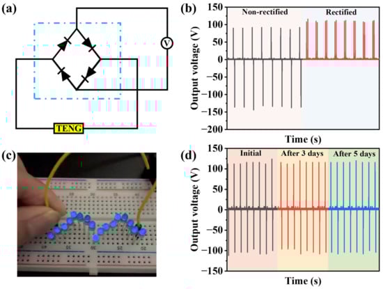 Figure 8c. Furthermore, the TENG was capable of directly powering 17 LEDs continuously. We also conducted the tests on our device at different time intervals, including 3 days and 5 days, to assess its repeatability, as illustrated in