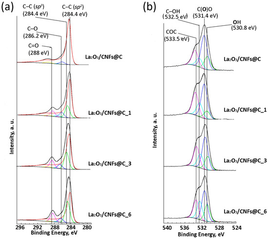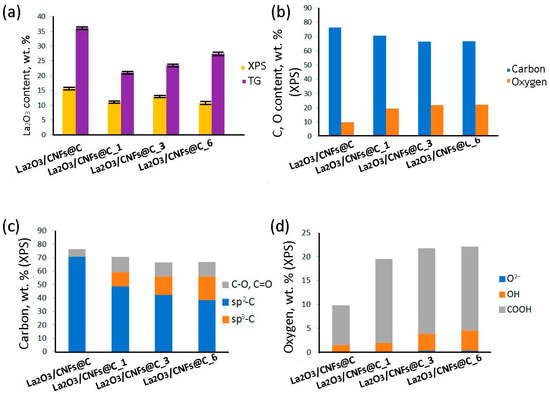The content of La2O3 in the samples is different for the samples with different x (Figure 4a) according to both TG (indicating the bulk composition of the sample) and XPS (reflecting the composition of approximately 10 upper layers of the surface). The extent and direction of the differences vary between TG and XPS, demonstrating different impacts of extension of the oxidation to the bulk and the surface of the samples. According to XPS data, the oxygen and carbon content differ as well. The amount of carbon decreased with the increase in oxidation duration, and oxygen understandably increased (Figure 4b). According to the C1s XPS spectra, the oxidized samples La2O3/CNFs@C_x have sp2- and sp3-hybridized carbon atoms and oxygen-bonded carbon species (Figure 5a) [64]. The O1s XPS spectra show that oxygen can present as O2− in the La-O fragments, lanthanum-bonded hydroxyl groups (OH−), and different oxygen species, C–O, C=O, etc., bonded to carbon atoms (Figure 5b) [64]. The ratio between different carbon and oxygen forms changed with a change in gas-phase oxidation duration (Figure 4c,d).