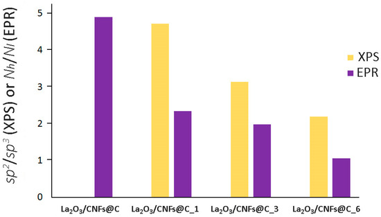 The correlation between the ratio of sp2 and sp3-hybridized carbon atoms for samples according to XPS and EPR data is shown in Figure 8. The sp2/sp3 ratio (XPS) and Nh/Nl ratio (EPR) associated with sp2/sp3 decreased with an increase in the oxidation time according to both methods. The sp2/sp3 ratio for non-oxidized sample La2O3/CNFs@C could not be assessed by XPS due to the massive prevalence of sp2-hybridized carbon atoms. This ratio became assessable only after the oxidation of the sample. The Nh/Nl ratio could be assessed by EPR for all samples. This difference can be attributed to the higher impact of the oxidation towards the surface assessed by XPS and the preservation of the bulk sample assessed by EPR.