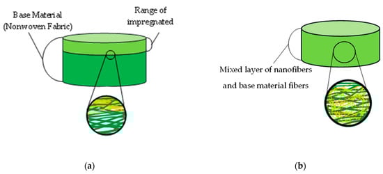 For Shinwa 1-1–1-4, the base NWF was made of polypropylene (PP), and the nanofibers were made of PVDF. Shinwa 1-5 is used for these base materials. For Shinwa 2-1–2-4, the nanofibers were made of PVDF, but the base material was a core–sheath fiber, where the core part was made of PP, the sheath part was made of polyethylene (PE), and the ratio of PP to PE was 1:1; the base material was Shinwa 2-5. In Sample 1, the base material was PET, and the nanofibers were made of polyethersulfone (PESU).
