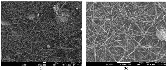 Microscopy observations (JSM-7800F Prime FE-SEM, JEOL). Sample A at (a) 500× and (b) 2000× magnification. Notably, the substrate fibers and nanofibers are clearly visible.