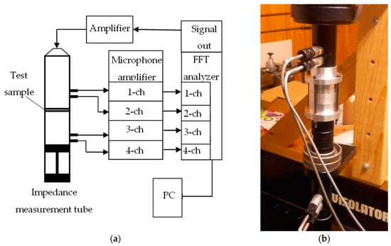 Figure 7a,b show a schematic and photograph depicting the experimental setup for measuring transmission loss. A sample was placed in a Brüel & Kjær (Teknikerbyen, Virum, Denmark) Type 4206 four-microphone impedance measurement tube, and a sinusoidal sound wave was produced from a speaker attached to a signal generator incorporated into a fast Fourier transform (FFT) analyzer. The cross-spectrum between the sound pressure signals of the four microphones attached to the impedance tube was measured using the FFT analyzer, and transmission loss was calculated using the measured cross-spectrum in accordance with ASTM E2611-09. The NWF being measured was supported without tension at a specified position in the impedance tube.