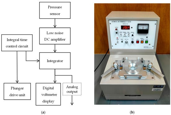 Air permeability tester (KES-F8-AP1, Kato tech Co., Ltd.): (a) Schematic; (b) Photograph. A plunger-type air permeability tester was used in this study, enabling measurements even in scenarios with high ventilation resistance.