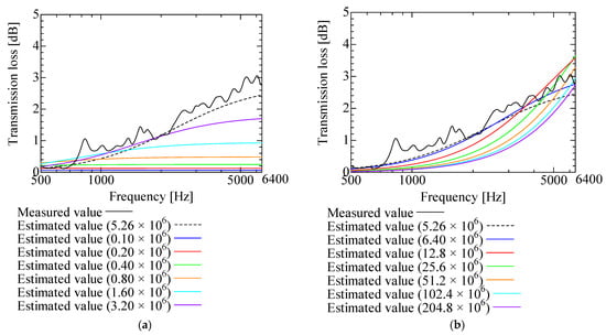 Variation of estimated transmission loss with flow resistivity: (a) Flow resistivity 0.10 × 106–3.20 × 106 and 5.26 × 106; (b) Flow resistivity 6.40 × 106–204.8 × 106 and 5.26 × 106.