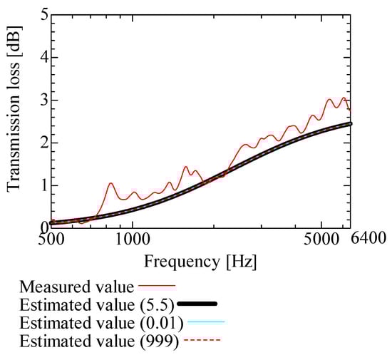 Variation of estimated transmission loss with thermal characteristic length: thermal characteristic lengths of 0.01, 999, and 5.5.