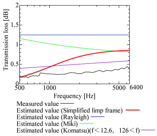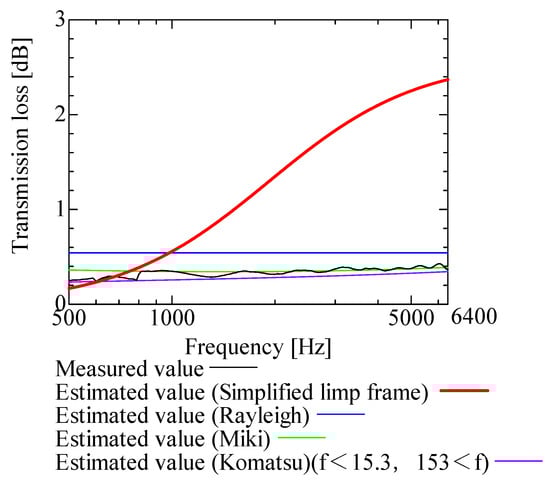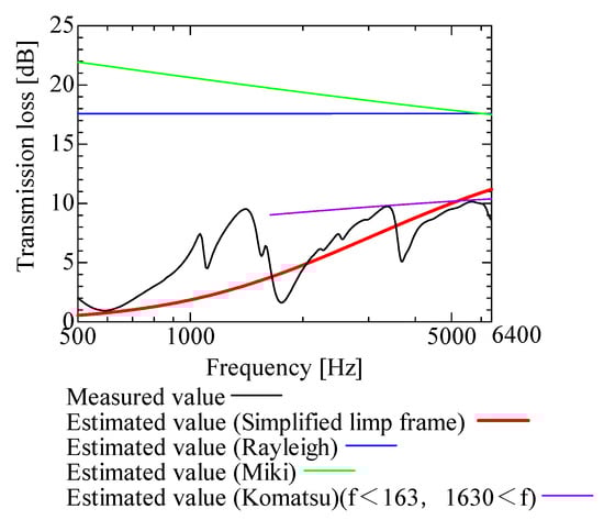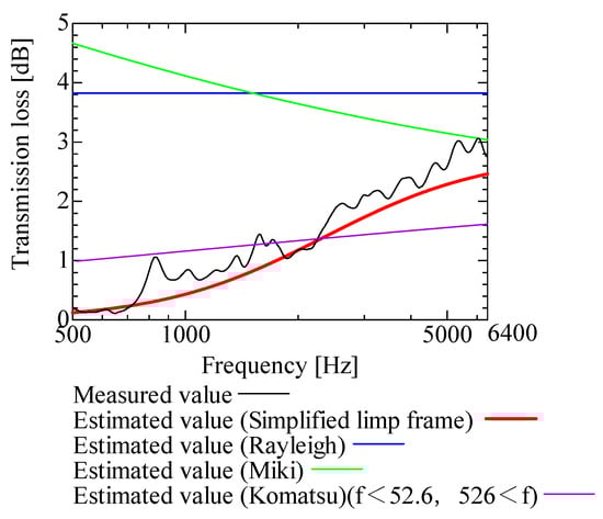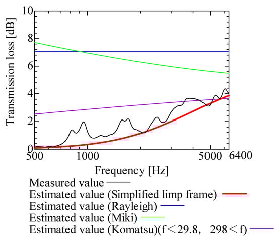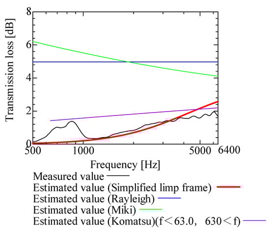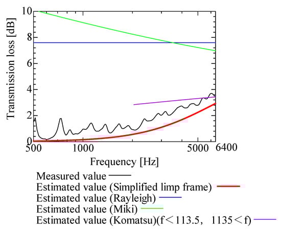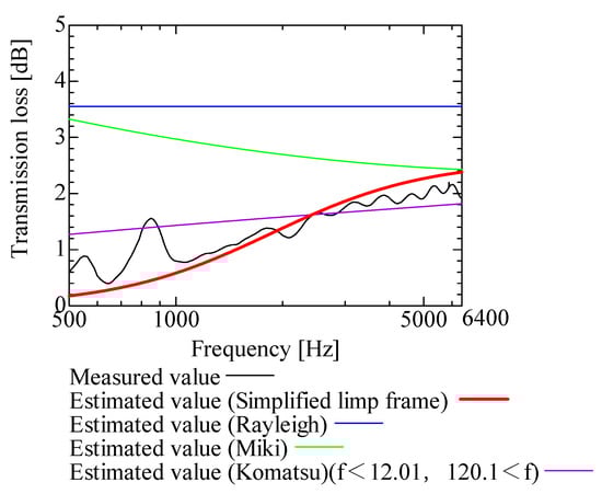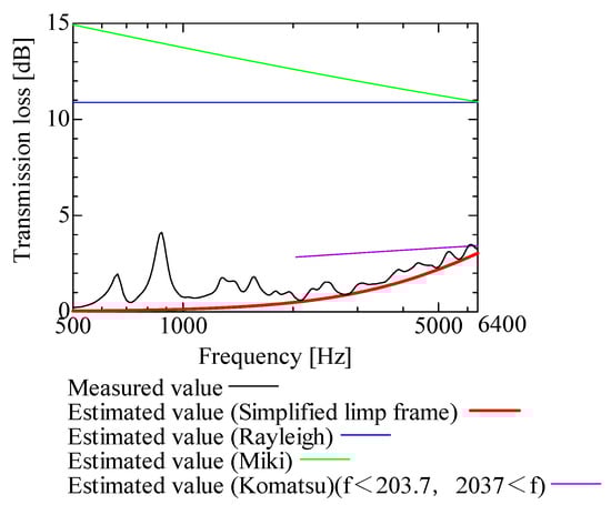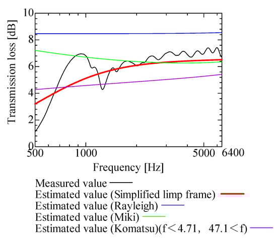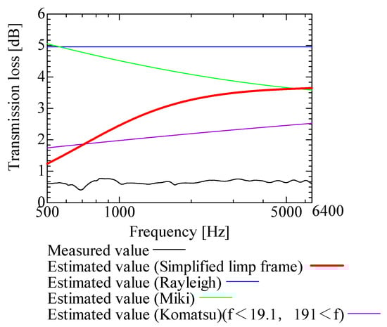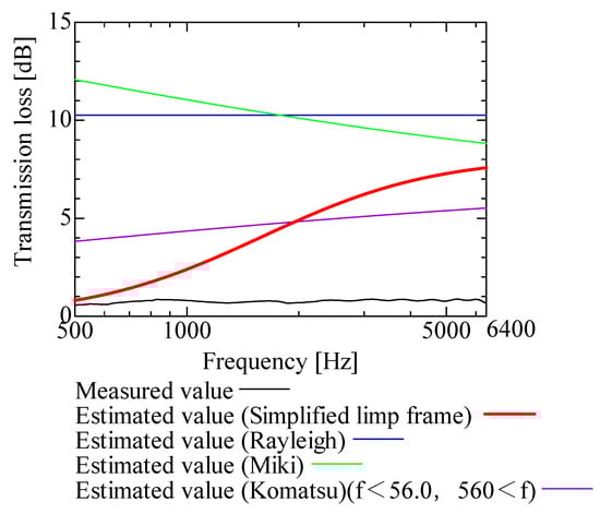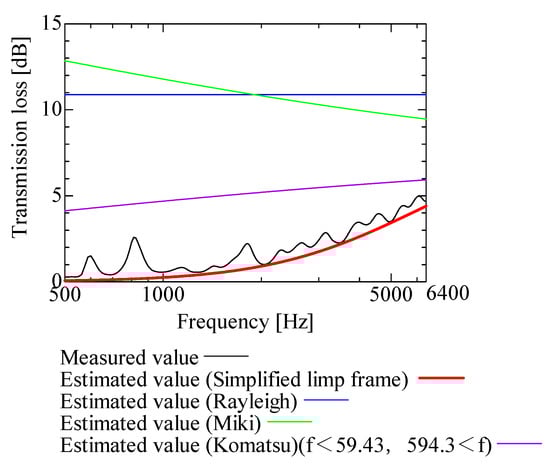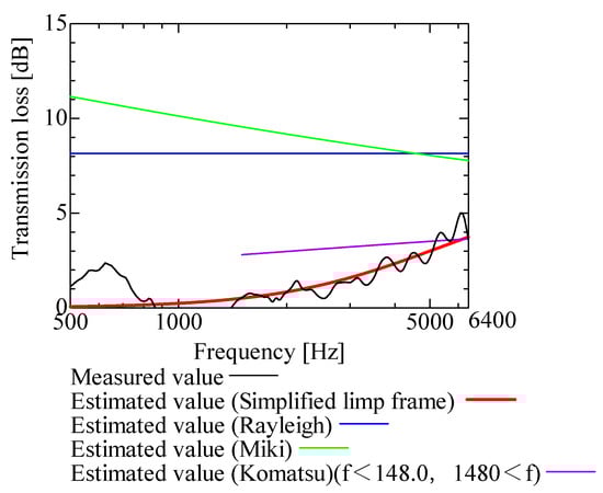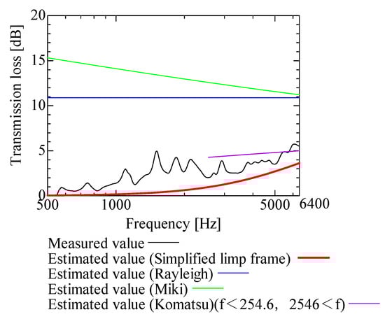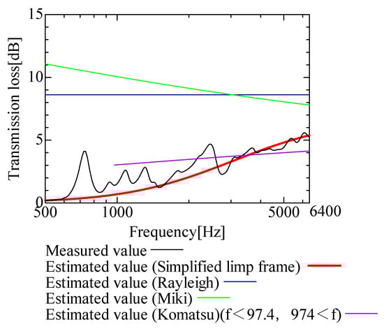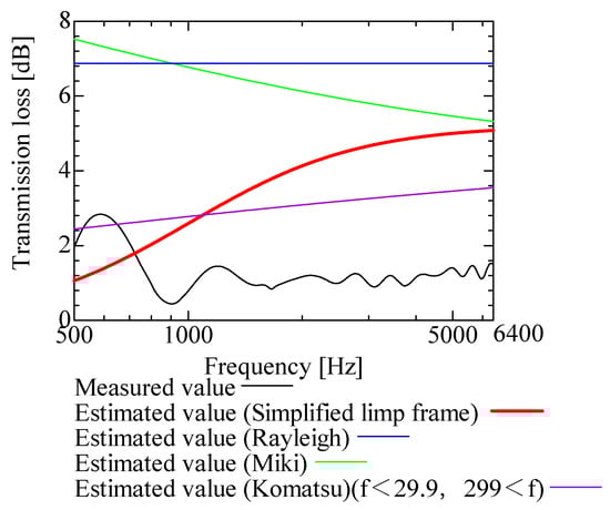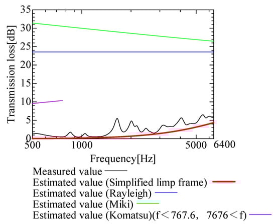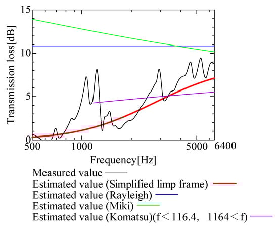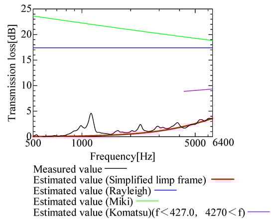 In this section, the transmission loss of NF-NWFs is estimated using the conventional Rayleigh, Miki, and Komatsu models and the proposed SLFM. Figure 14, Figure 15, Figure 16, Figure 17, Figure 18, Figure 19, Figure 20, Figure 21, Figure 22, Figure 23, Figure 24, Figure 25, Figure 26, Figure 27, Figure 28, Figure 29, Figure 30, Figure 31, Figure 32 and Figure 33 show the experimental and estimated results for the NF-NWF samples in order from the sample with the largest transmission loss, and Table 1 shows the corresponding figure number for each sample.