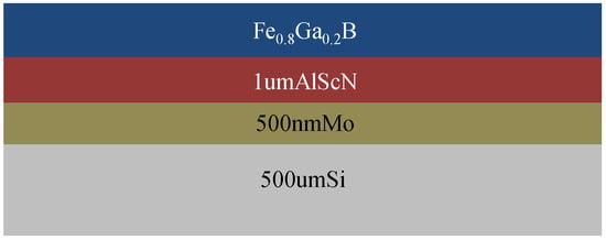The composition ratio and structure parameters play a crucial role in determining the magnetostrictive properties of FeGaB [21] thin films, which can be regulated by process parameters. A cross-sectional diagram of the composite film is shown in Figure 1. The substrate is single-crystal silicon with a thickness of 500 μm, on which is 500 nm Mo, 1 μm Al0.8Sc0.2N, and Fe0.8Ga0.2B magnetostrictive film in sequence. As the composite film is used for the preparation of an ME sensor, Mo acts as the bottom electrode of the sensor, Al0.8Sc0.2N is the piezoelectric film, and Fe0.8Ga0.2B thin film is the magnetostrictive layer.