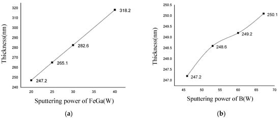 (a) Thickness variation for FeGa sputtering power; (b) thickness variation for B sputtering power.