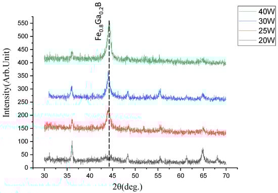 Figure 5 is the XRD image of Fe0.8Ga0.2B thin films corresponding to different sputtering powers of FeGa targets. The B target power remains at 46 W, and when the FeGa sputtering power changes, strong diffraction peaks appear at both 25 W, 30 W, and 40 W. The grain size of the thin film can be calculated using Scherrer’s formula: