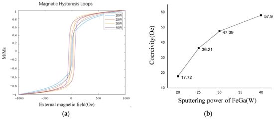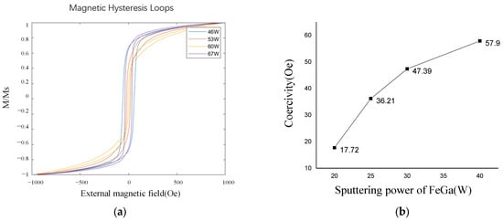 The magnetic hysteresis loops of the samples can be measured by a vibrating sample magnetometer (VSM). By applying an external magnetic field from −1000 Oe to 1000 Oe and repeating this process, the magnetic hysteresis loop of the Fe0.8Ga0.2B film is obtained through measuring its magnetization intensity. The coercivity is defined as the external magnetic field applied on the films when the internal magnetization intensity of the films is zero. Thus, through the analysis of VSM curves, the coercivity of the films can be obtained. A lower coercivity of a film means better soft magnetic properties and a greater sensitivity of an ME sensor, so by comparing the coercivity of different samples, the optimal process parameters can be achieved.