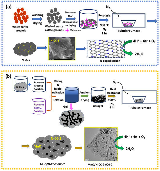 (a) Schematic of the synthesis of N-doped carbon from waste coffee ground. (b) Schematic of the synthesis of MnO/N-CC-2-900-2 catalyst via sol-gel synthesis with heat treatment.