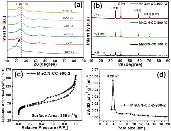 (a) XRD patterns to support the effect of heat treatment at 900 °C improving the graphitization and properties of N-doped carbons. (b) XRD patters to exhibit that MnO phase is formed in Mn-oxide and supported on N-CC catalysts at different temperatures, with increasing crystallization and size of MnO nanoparticles. (c) BET data to prove that the MnO/N-CC-900-2 catalyst exhibits a porous nature, similar to traditional Vulcan carbon support, enhancing oxygen reduction reaction (ORR) kinetics. (d) Pore size distribution data to support that the MnO/N-CC-900-2 catalyst contains predominant mesopores, facilitating efficient oxygen delivery and water removal, contributing to improved ORR kinetics.