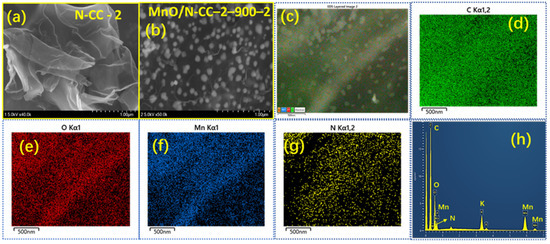 SEM images of (a) N-CC-2, (b) MnO/N-CC-2-900-2 catalysts, (c) SEM images of the EDS image used for the elemental mapping of (d) C, (e) O, (f) Mn, (g) N, and (h) EDAX spectrum of MnO/N-CC-2-900-2 catalysts.