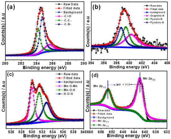 To obtain further insights into the chemical states of the elements present in the MnO/N-CC-2-900-2 catalyst, XPS analysis was carried out, and all the elements’ spectra were further deconvoluted. Figure S1 shows the XPS survey spectra of the MnO/N-CC-2-900-2 catalyst, which confirms the existence of the C, N, O, and Mn species. The C1s deconvoluted spectra (Figure 5a) show the peaks associated with the -C-C-, -C-N-, and -C=O- chemical bonding in the catalysts, which resulted from the hexagonal carbon framework, the N-doped into the carbon matrix, and the surface oxygen functionalities of the carbon at the binding energies of 284.2, 284.6, and 285.7 eV, respectively. The appearance of -C-N bonding clearly confirms that the N doping into the carbon matrix has been accomplished. Further, it is well known that the N doping into the carbon matrix results in a different bonding environment with carbon, namely, pyridinic-N, graphitic-N, and pyrrolic-N, which appears at different binding energy levels that could be identified from the high resolution deconvoluted spectra of N [31]. Figure 5b shows three different peaks at the binding energies of 398.6, 399.5, and 400.4 eV, corresponding to the pyridinic-N, pyrrolic-N, and graphitic-N species, respectively. It is well known that all of these forms are active for ORR, though there is ambiguity around which one of these bonding environments is truly active. However, there are enough evidence that the order of activity follows pyridinic-N > graphitic-N > pyrrolic-N. The doping of N is known to break the electroneutrality-induced electronic charge density and spin density of the carbon atoms, which serves as active catalytic centers for the ORR reaction [63,64]. In addition, N-doping helps in increasing the electronic conductivity of the catalysts and increasing the electronic density around the Mn catalytic active sites, resulting in enhanced ORR activity. Figure 5c shows the deconvoluted O1s spectra which shows three deconvoluted peaks at the binding energies of 529.9, 531.3, and 532.7 eV, corresponding to the O atom bonding in Mn-O-Mn, Mn-O-H, and C-OH [65,66]. Figure 5d shows the Mn2p spectra of the MnO/N-CC-2-900-2 catalyst, which showed a typical peak around 641.98 and 653.48 eV, which is attributed to the binding energy of the Mn 2p3/2 and Mn 2p1/2 states, respectively. The binding energy separation between c is found to be 11.50 eV, which is consistent with the literature reports on the MnO nanoparticles [67,68,69]. The XPS analysis prove the presence of C-N bonding, which implies the successful doping of N atoms into the carbon matrix. In addition, the existence of pyridinic-N, graphitic-N, and pyrrolic-N proves that the N-doped carbon support can perform the ORR both independently and together with assisting the MnO in enhancing the overall ORR activity by supplying electrons to the active sites. The existence of Mn-O-Mn and the typical charge separation between the binding energy of the Mn 2p3/2 and Mn 2p1/2 states clearly prove that the MnO nanoparticles are deposited on the N-doped carbon support; hence, any outstanding ORR activity can be expected to be shown in half-cell and the MFCs’ set up.