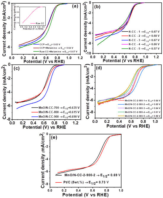 LSV curves of (a) CCP, CCP + melamine, raw-CC + melamine catalysts, (b) N-CC catalysts with different melamine contents, (c) MnO/N-CC-2 catalyst with heat treatment at different temperatures, (d) MnO/N-CC-2-900-2 catalysts synthesized with different contents of N-CC-2 carbon, and (e) LSV comparison of MnO/N-CC-2-900-2 catalysts with Pt/C (5 wt.%). All the LSV curves were recorded in O2 saturated with 0.1 M of HClO4 electrolyte, with a scan rate of 10 mV/s, and the room temperature condition.