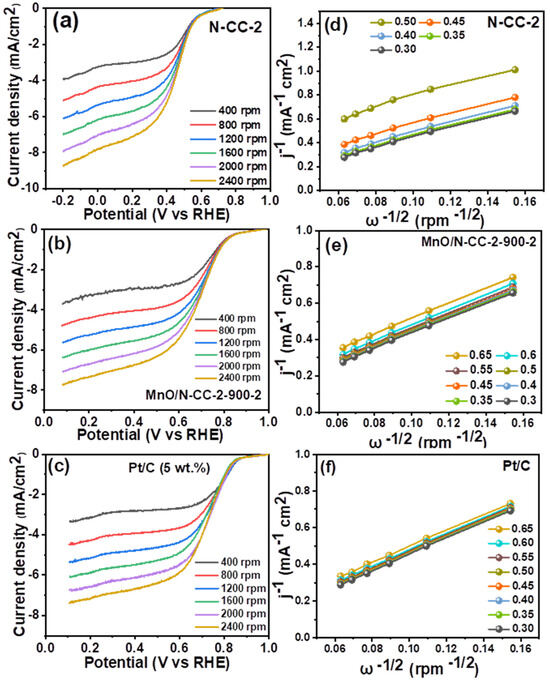 Taking readings of the LSV of the N-CC-2, MnO/N-CC-2-900-2, and Pt/C catalysts at various rotations (Figure 7a–c) and then constructing the K-L plots (Figure 7d–f) provide insight on the ORR pathway. It is well known that ORR occurs in either a direct 4-electron reduction or a 2 + 2 electron reduction [31]. A direct 4-electron reduction pathway results in the formation of H2O as a final product, whereas a 2 + 2 reduction pathway results in the formation of undesirable H2O2, which further undergoes decomposition and reduction to H2O. The former pathway leads to higher efficiency, whereas the latter one leads to less efficiency of the ORR process. Moreover, the formation of H2O2 causes the degradation of the catalyst support and the membrane; hence, a direct 4-electron pathway or near to the 4-electron pathway is essential for the ORR catalyst. In order to estimate the ORR process’ efficiency, the K-L plots (i.e., the plots of inverse of the square root of rotation speed versus the inverse of the current density) are utilized to determine the number of electrons involved in the ORR process. Figure 7a–c exhibits the ORR curves recorded at different rotations which show that ORR is O2 diffusion-controlled reactions, with the limiting current increasing as the rpm for all the three catalysts increases, without any noticeable change at the onset potential. This indicates that the ORR kinetics are similar at all rpms and the only change observed in the mixed kinetics-diffusion controlled and diffusion-controlled regions of the LSV curves. In addition, the linear K-L plots (Figure 7d–f) for all the three catalysts also suggest that an almost similar electron transfer number can be predicted at all the potentials. The calculated number of electrons were found to be an average of 3.91, 3.94, and 3.98 electrons for the N-CC-2, MnO/N-CC-2-900-2 and Pt/C catalysts. Although some 2 + 2 electron reduction is still possible, the obtained ‘n’ close to 4 indicates that the catalyst primarily uses a direct 4-electron pathway to perform ORR.