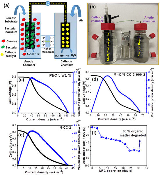 (a) Pictorial representation of dual-chamber microbial fuel cells and (b) laboratory working set-up of dual-chamber microbial fuel cells. i–v curves of (c) Pt/C and (d) MnO/N-CC-2-900-2 catalyst. (e) N-CC (f) TOC results of the anode chamber of the dual-chamber microbial fuel cells with MnO/N-CC-2-900-2 catalyst.